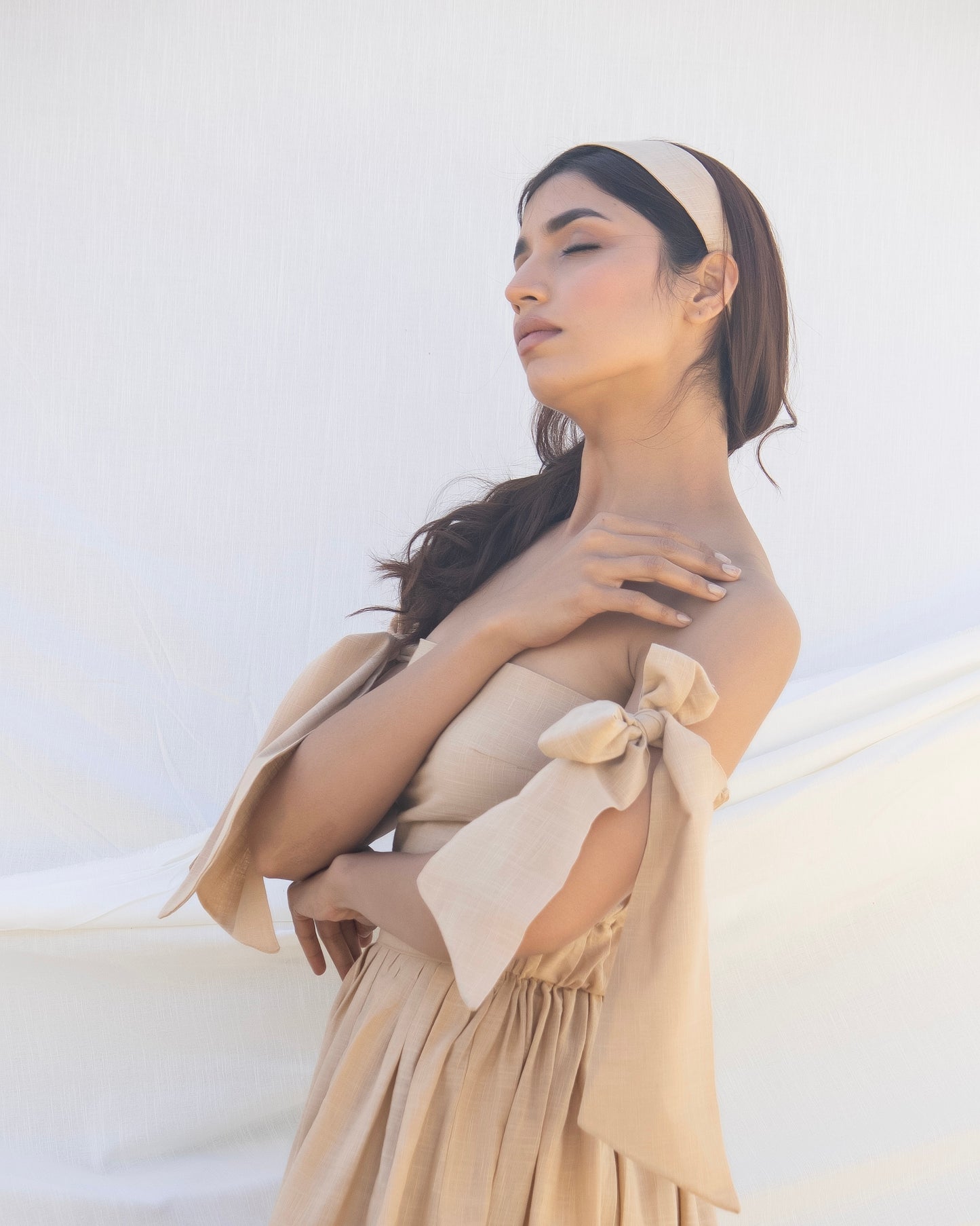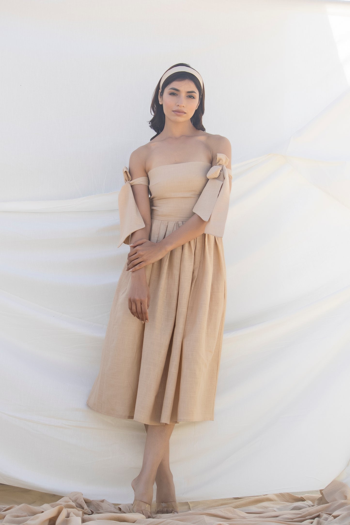 Cotton straight across neckline top with tie up bow knot on sleeves.