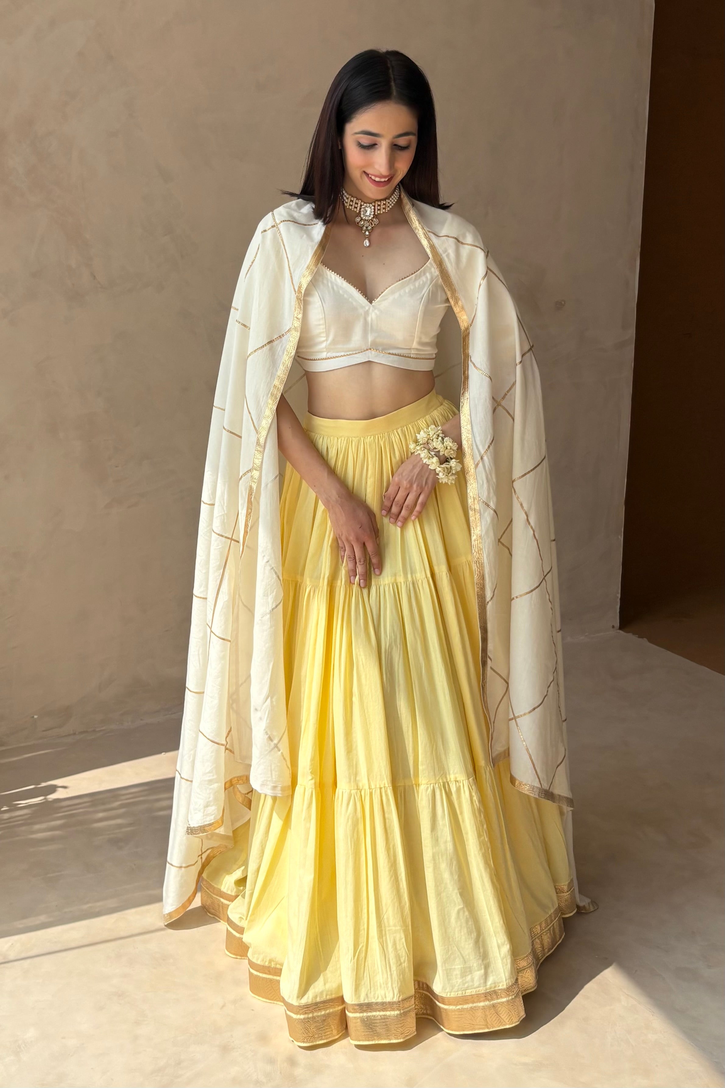 Crafted with 12 meters of pure cotton fabric. Fully lined. Set of three. •Length of lehenga - 42 inches •...