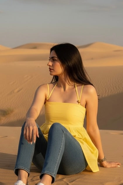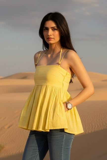 Peplum cotton top with wooden bead detailing. Adjustable straps.