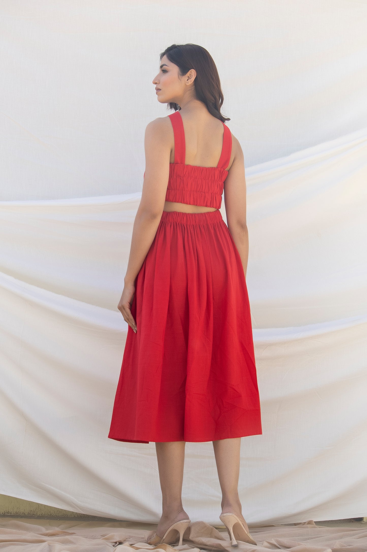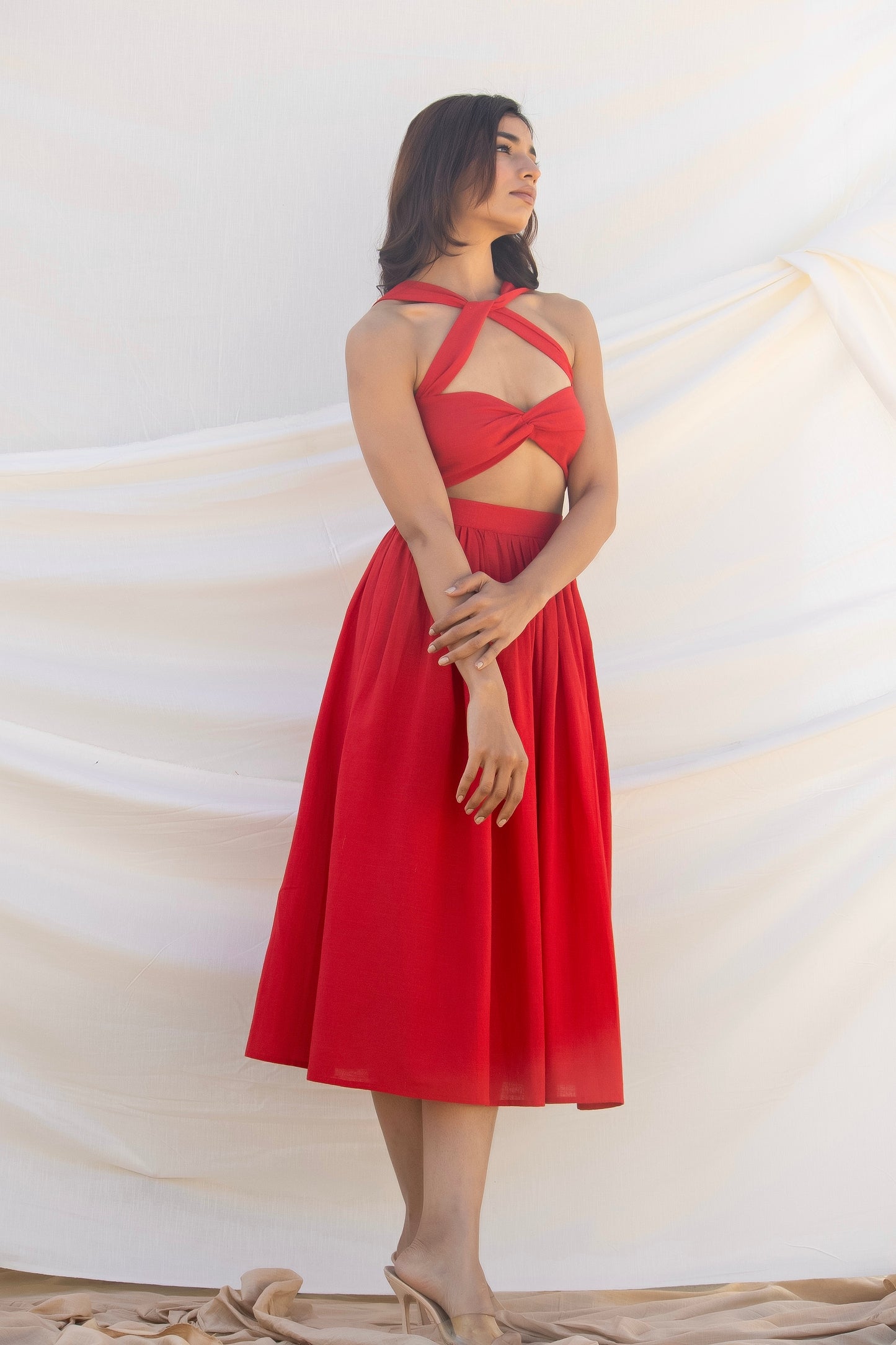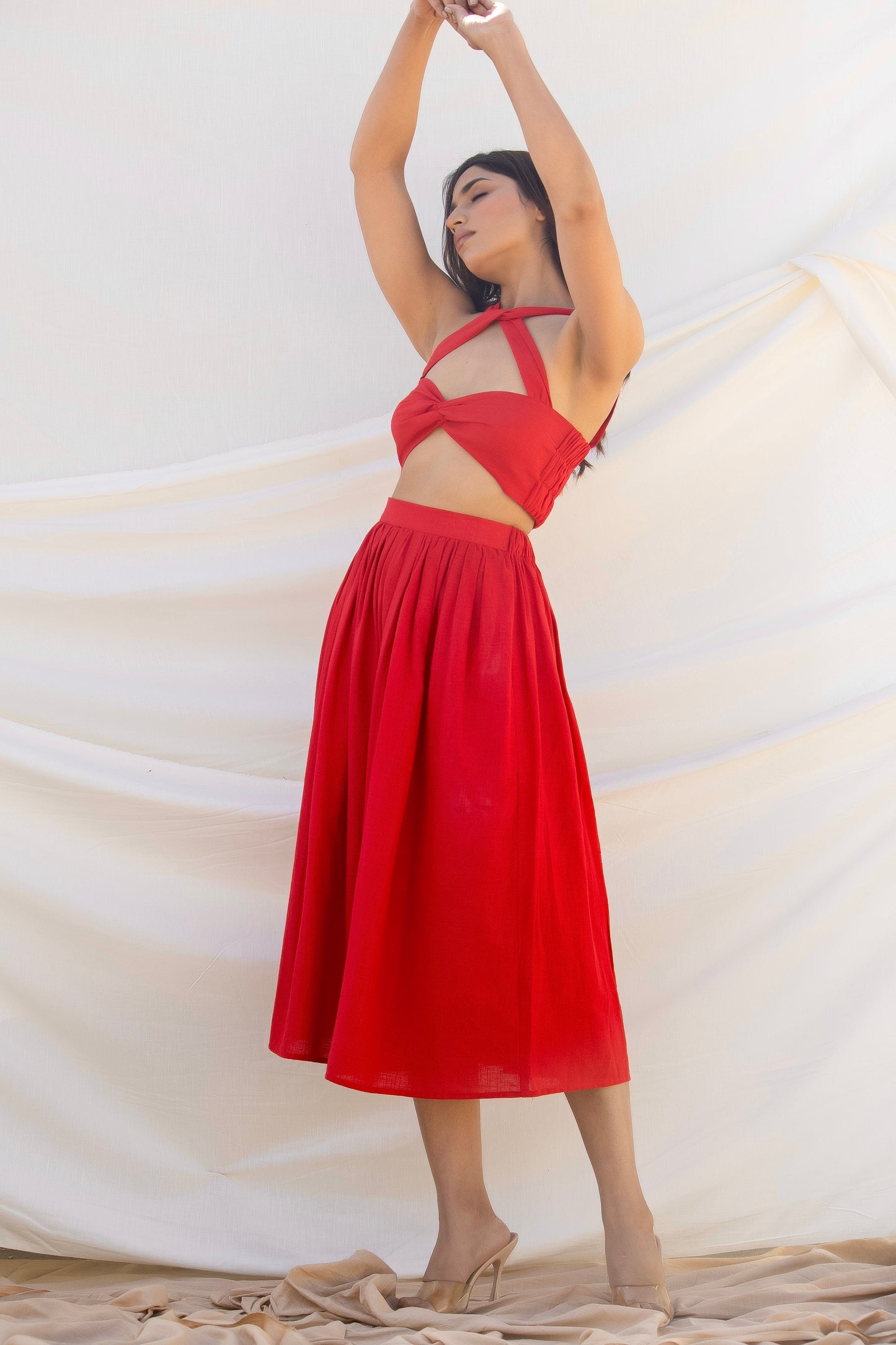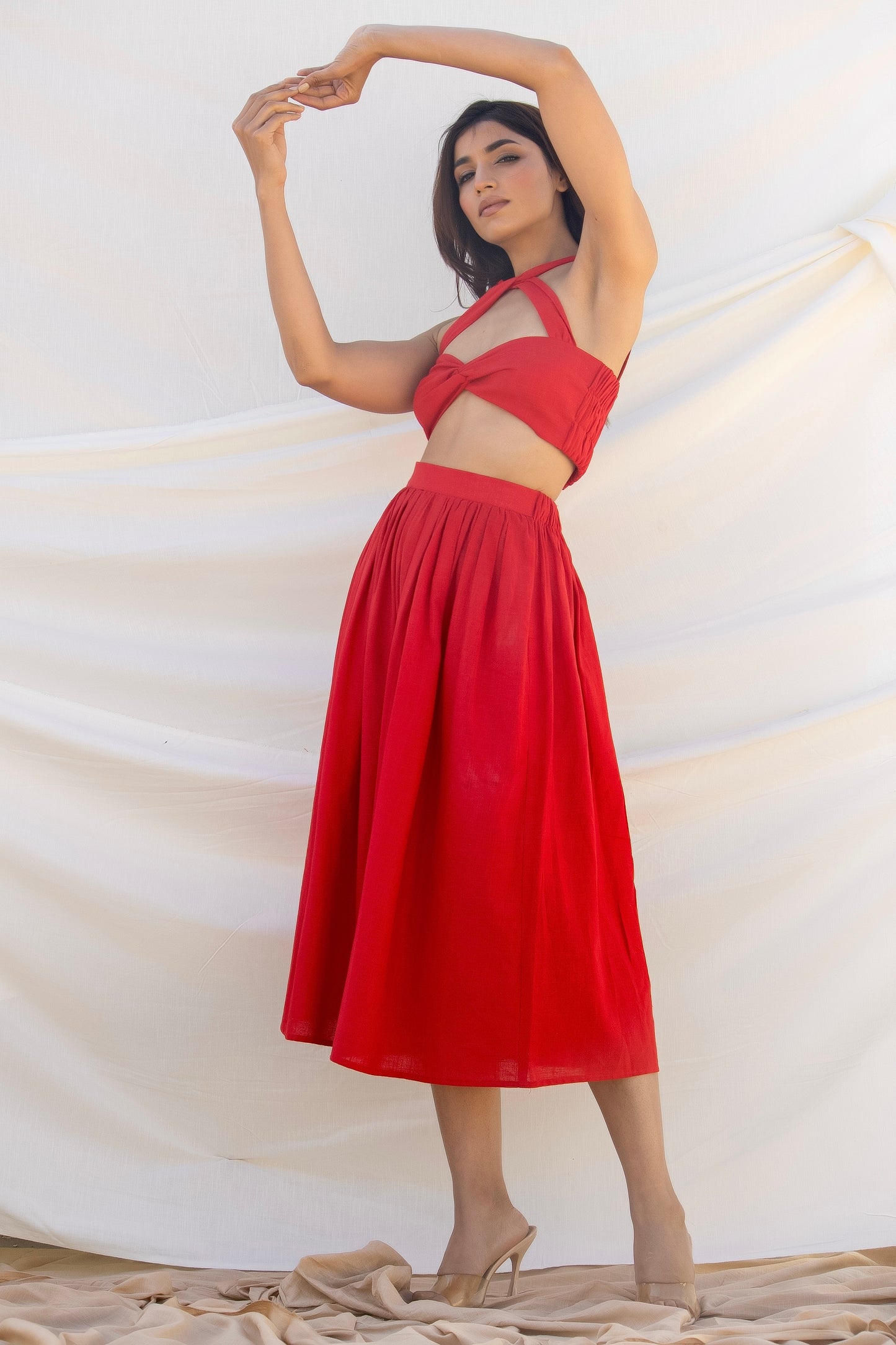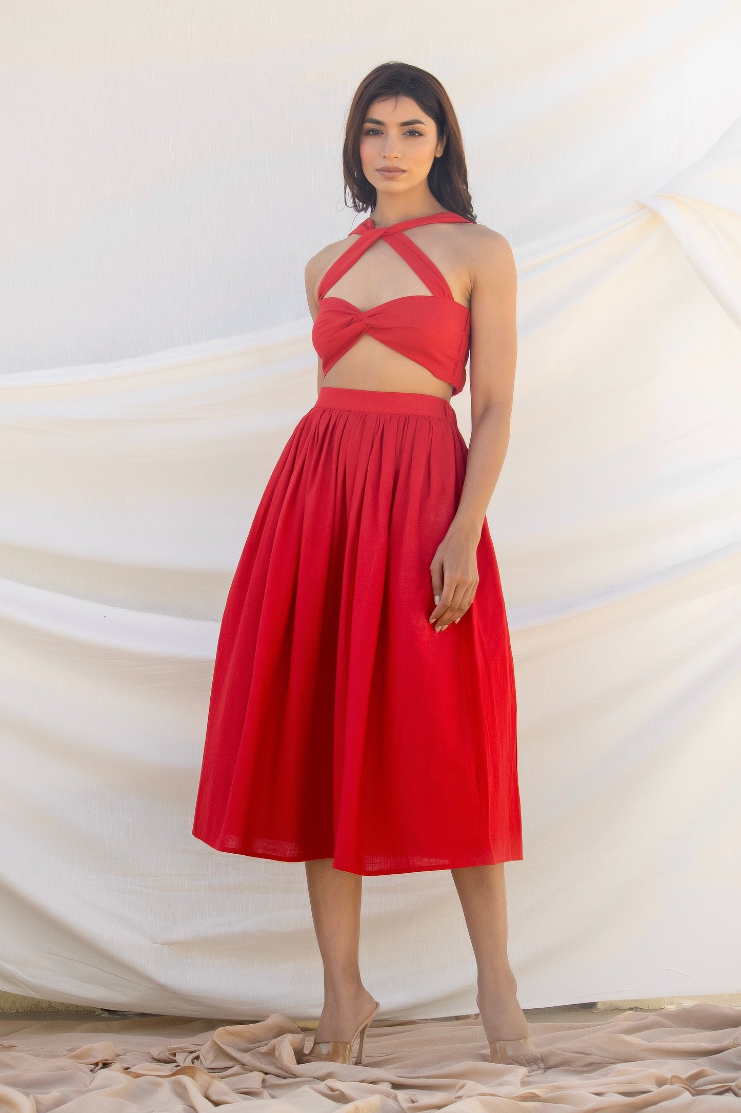 Co-ordinate set of gathered midi skirt and cotton front stitched knot crop top with cut-outs detailing that compliments shapes of the female silhouette.