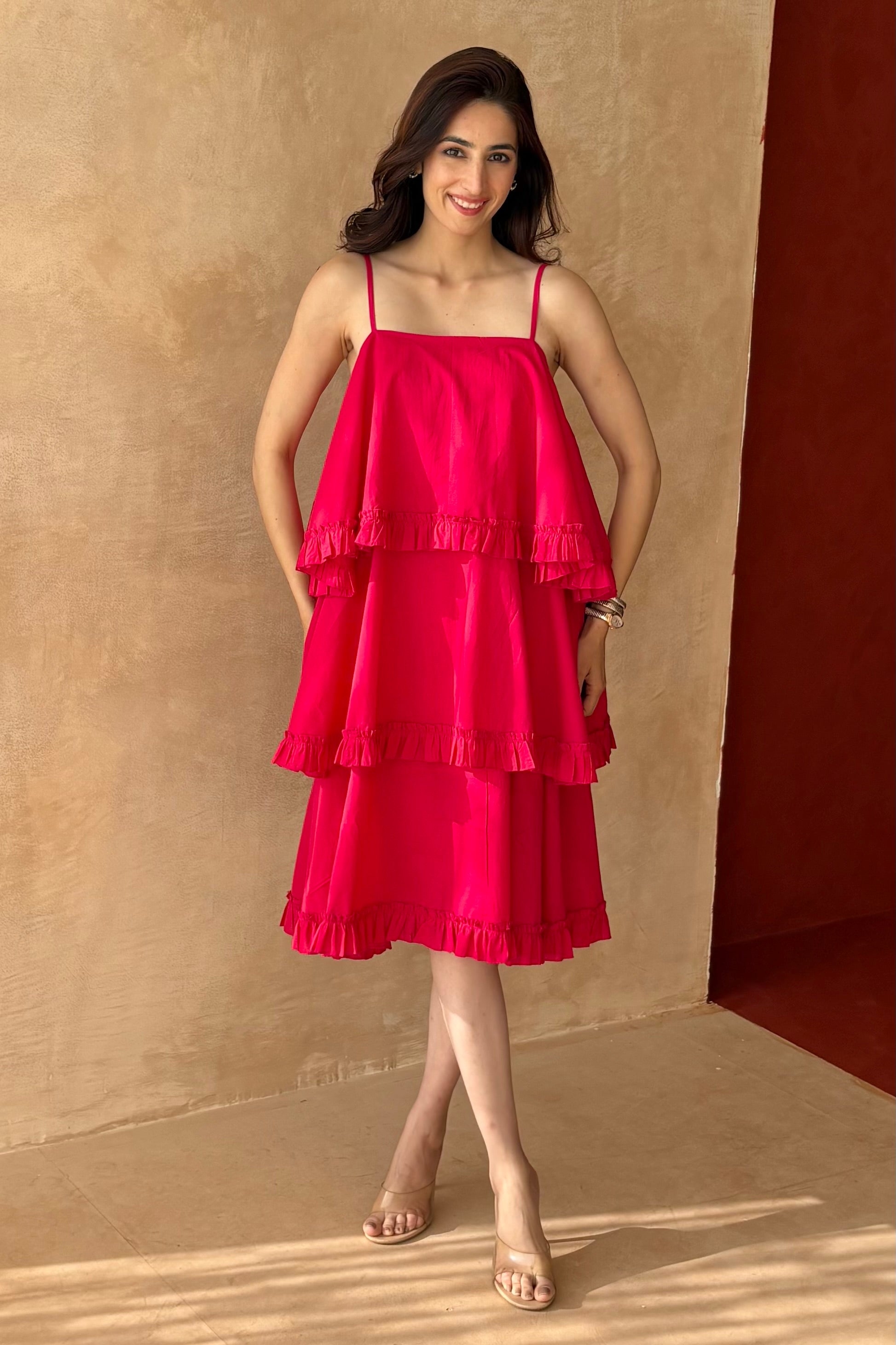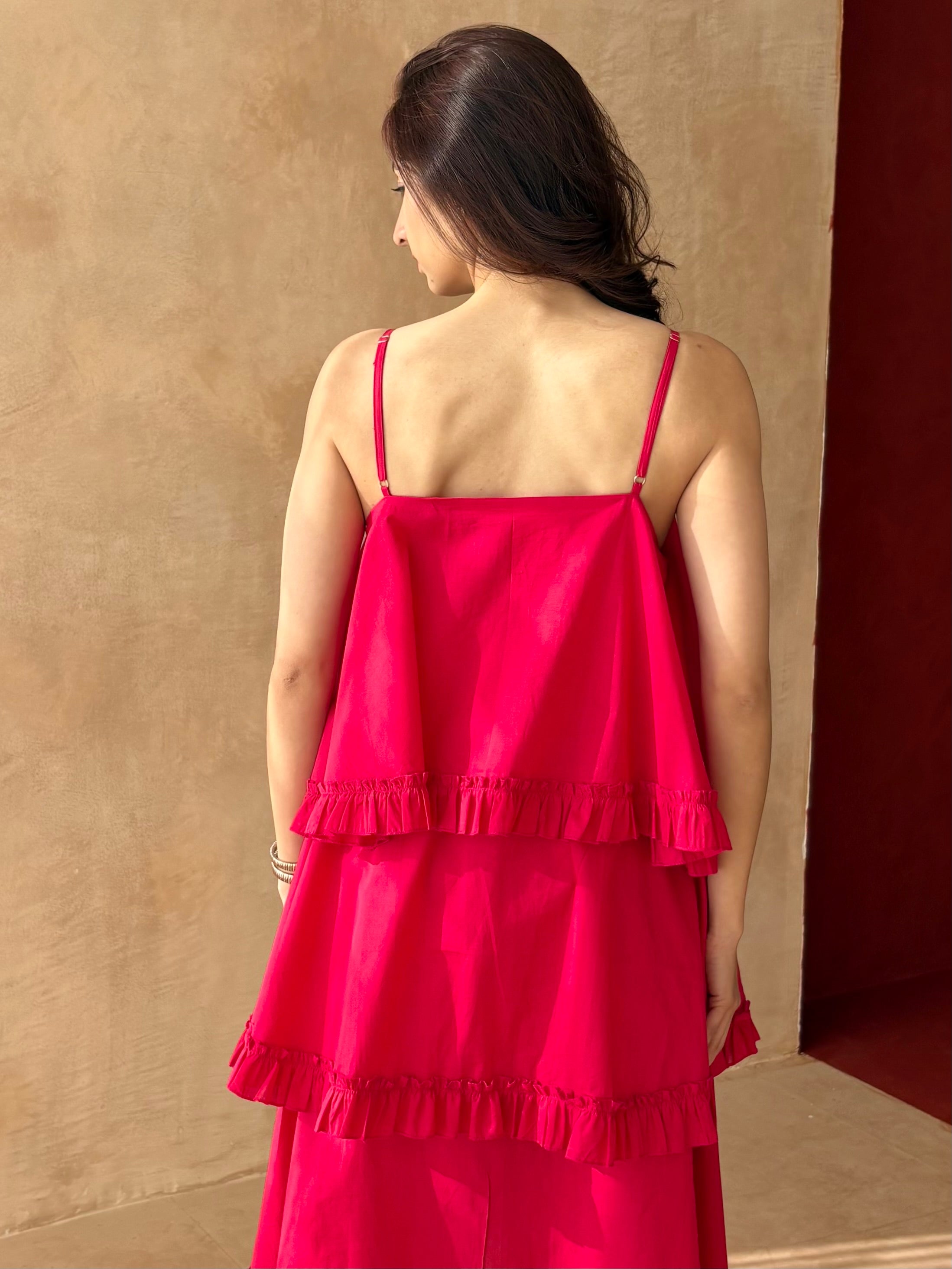 Multi tier pink cotton dress. Adjustable straps.