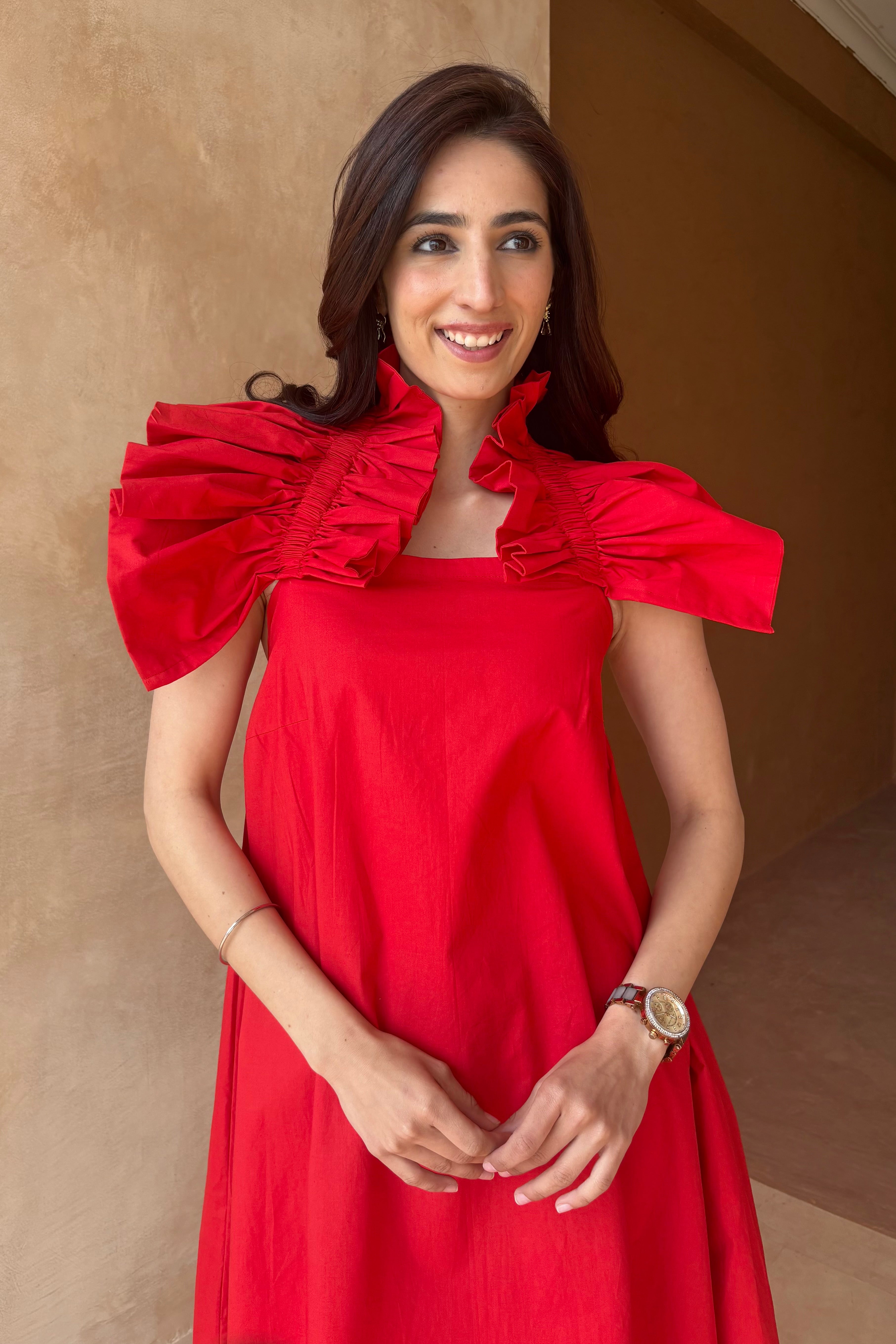 Red mini dress with shoulder wings details. Length - 37