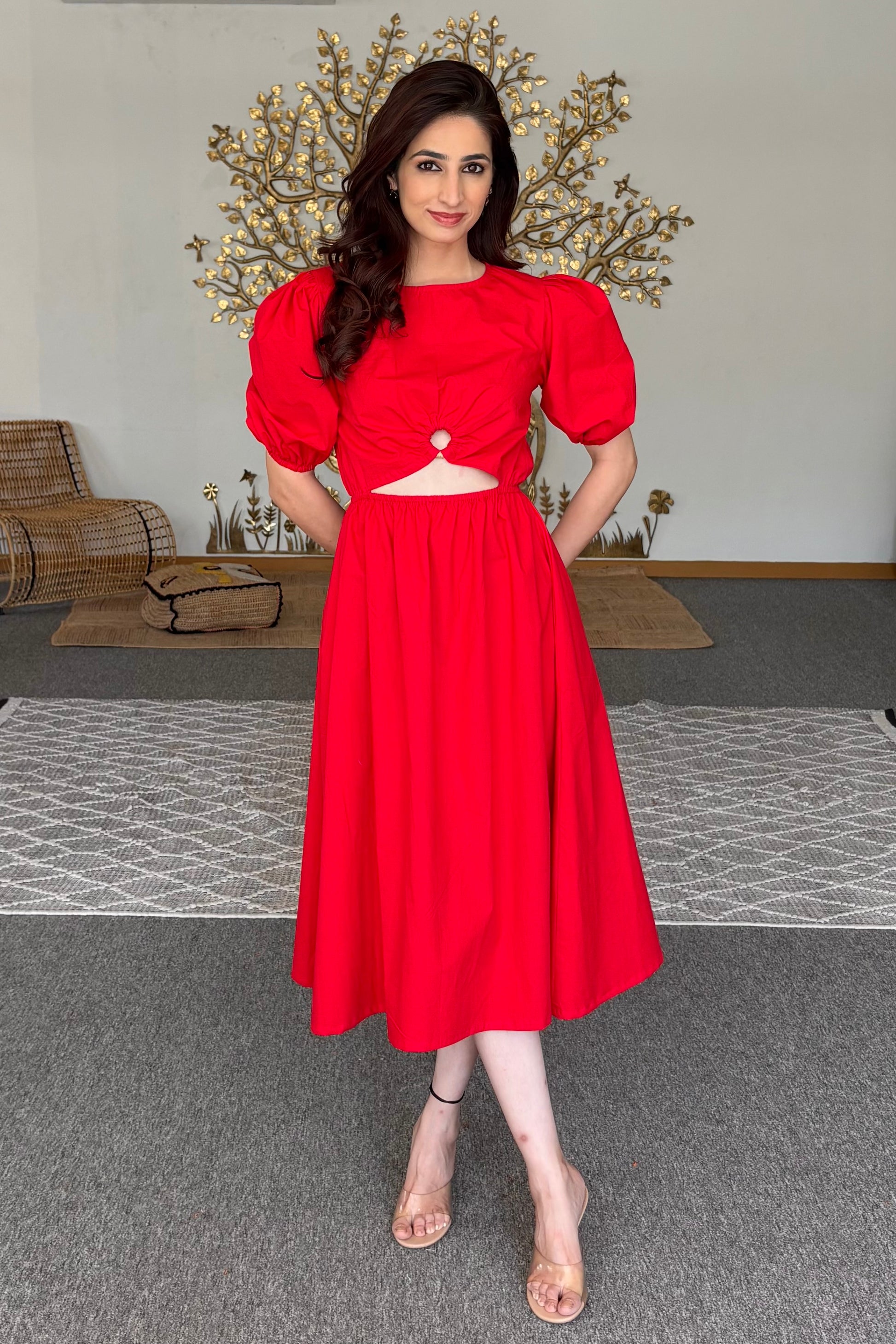 Red midi dress, wooden ring detail, waist cut-out.